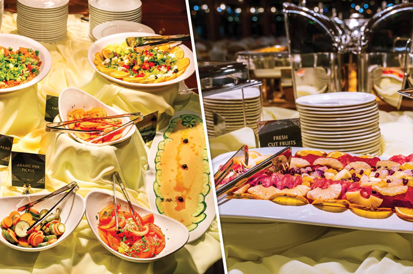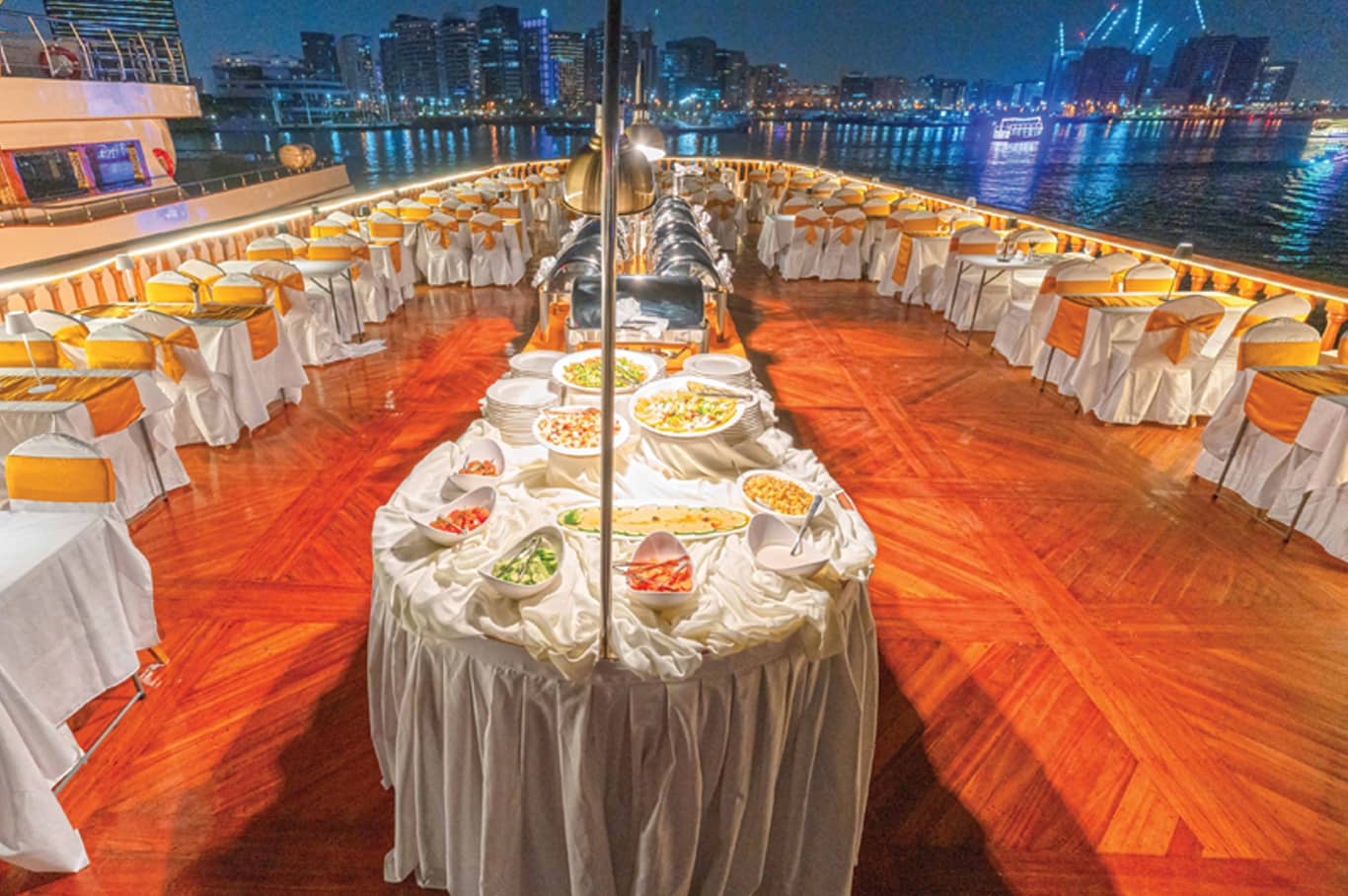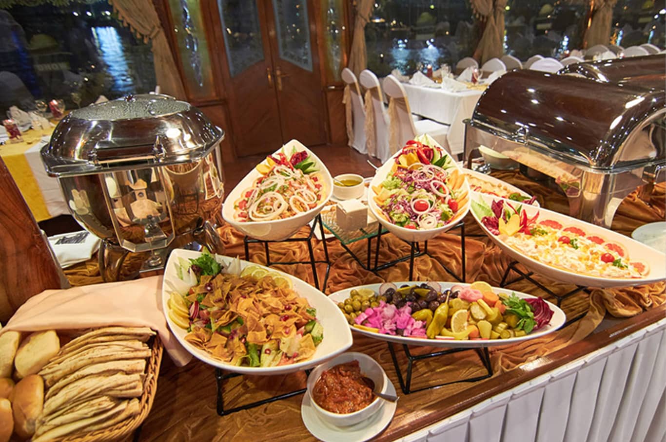 Asian, Indian, Arabic, and continental cuisines are all represented in the Dhow supper buffet. Both vegetarian and non-vegetarian tastes are catered to. Please let us know in advance if you are vegan or follow Indian Jain customs so that we may make separate plated meals for you.