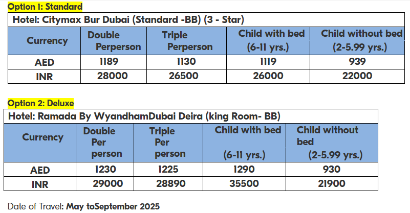 • This package will include a 30-day Dubai tourist visa. You will be needed to furnish the documentation necessary to process the VISA. Our agent will contact you after the booking to begin the Visa procedure.