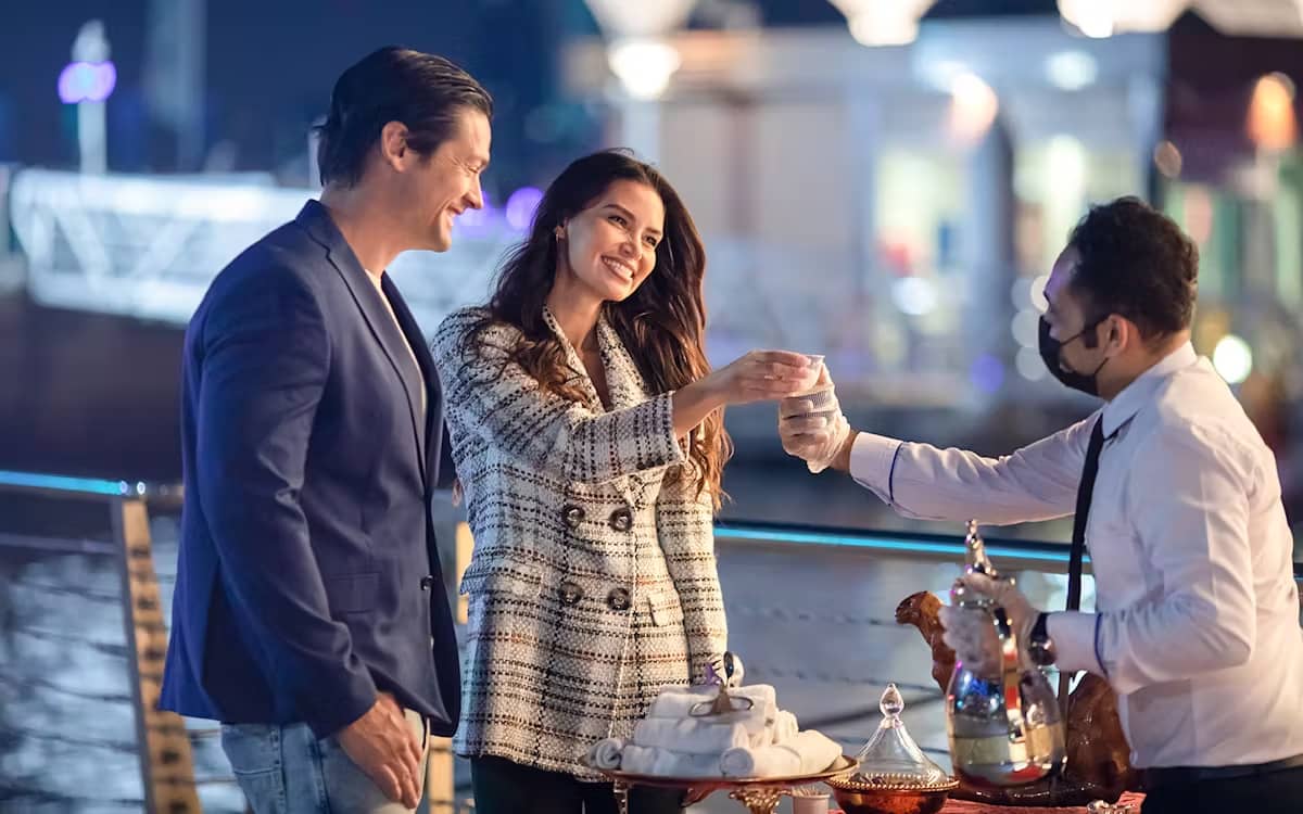Enjoy a transnational buffet while the Burj Khalifa, the IMAGINE water show, and other landmarks light up your evening on this Dubai Water Canal stint.