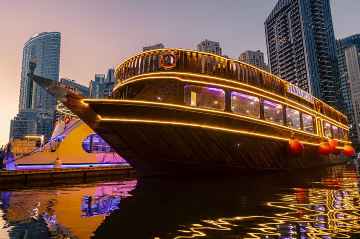 • Take a Tanoura dance and eat an international buffet when you set sail on the Alexandra Dhow, a renovated wooden boat, from the Dubai Marina.