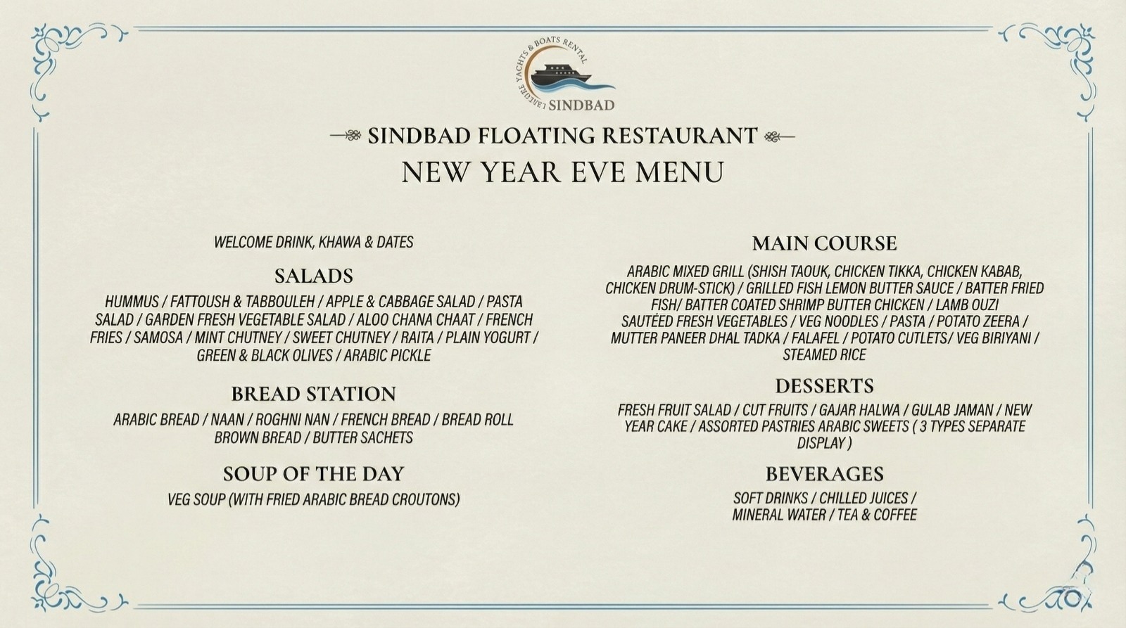 Sinbad NYE Menu