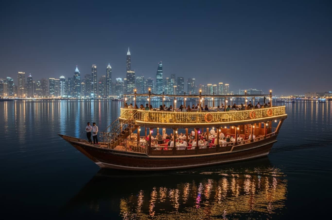 Feast on a lavish festive buffet dinner along with a selection of unlimited soft drinks or unlimited house beverages. As we ring in the New Year, a stunning firework display from Dubai Festival City and an incredible Burj Khalifa light show will elevate your experience, with the private Dhow top deck providing the best view in the city!